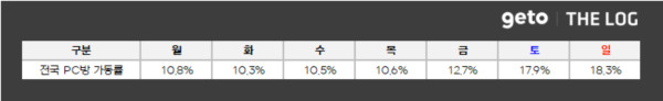 5월 5주 전국 PC방 총 사용시간은 약 1천 335만 시간으로 전주 대비 2.1% 감소, 전월 대비 18.1% 감소, 전년 대비 12.9% 감소한 수치이다. PC방 주간 가동률은 평일 평균 11%, 주말 평균 18.1%로 주간 평균 13%를 기록했다.