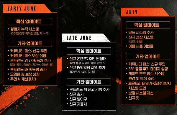 7월에는 기다리던 길드 시스템을 선보인다. 그동안 솔로 플레이 위주였던 게임에 협동과 경쟁 요소가 본격 도입되면서 커뮤니티 활성화에 큰 변화가 예상된다. 생존자 신규 성장 시스템으로 만렙이 개방될 것으로 보이며, 이는 캐릭터 육성의 한계를 뛰어넘어 더욱 다양한 빌드와 전략을 가능하게 할 것이다.
