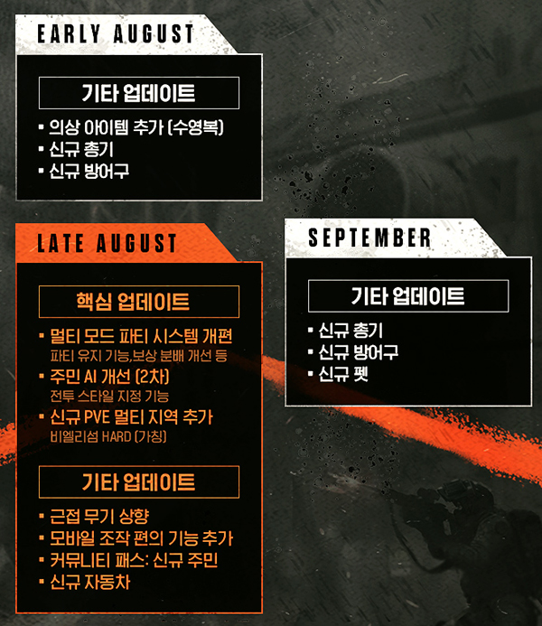 8월 말에는 멀티 모드 파티 시스템을 개편해 파티를 유지하고, 보상 분배 개선이 이뤄진다. 현재 파티 플레이에서 지적되고 있는 불편함이 해소되면서 협력 플레이의 만족도가 크게 향상될 것으로 기대된다. 6월에 이어 주민 AI는 2차 개선이 진행되어 전투 스타일 지정 기능이 도입된다.