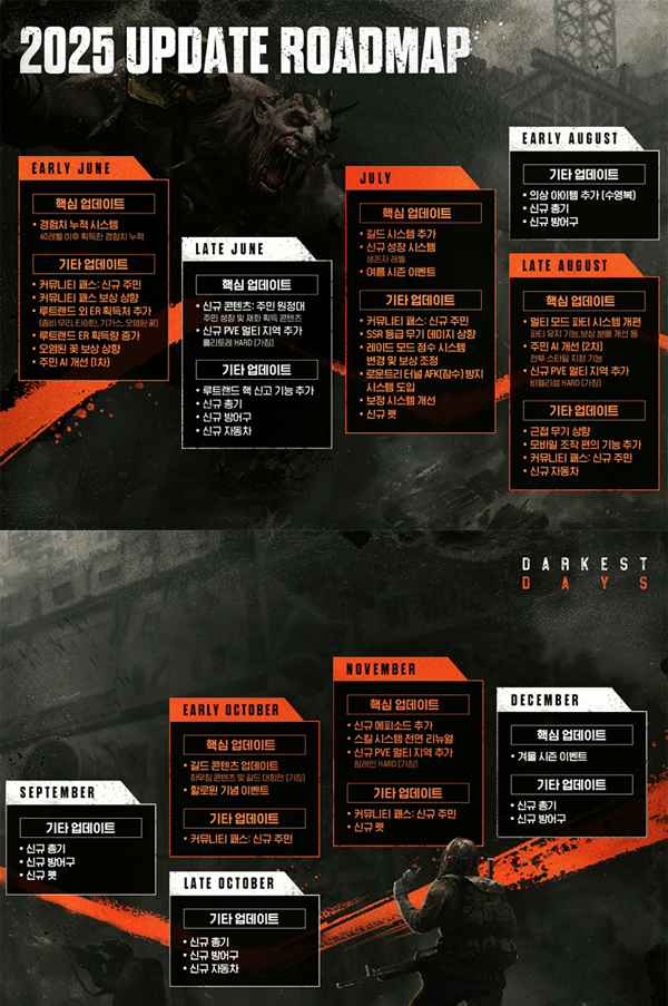 '다키스트 데이즈'의 초반 게임 서비스가 하드코어하고 진중한 게임이었다면, 이제 더 많은 유저들이 게임을 즐길 수 있도록 난이도를 완하면서 가볍게 즐길 수 있는 게임으로 진화해 나간다. 특히 오픈 베타 이후 첫 대규모 업데이트를 통해 강화 확률 완화와 주요 재료 수급처 확장을 추진, 유저 중심의 게임 서비스를 선보였다.