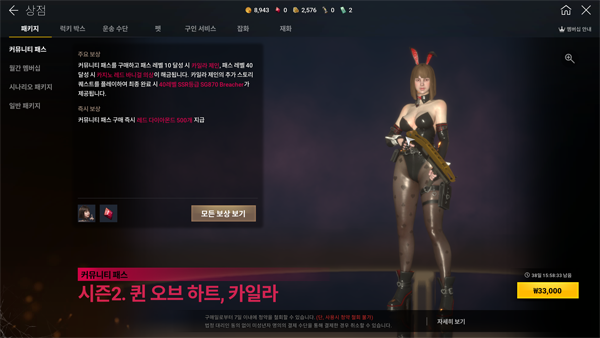유저들은 신설된 커뮤니티 패스를 통해 '카일라 제인'을 얻을 수 있다. 커뮤니티 패스는 무료 보상과 플러스 보상으로 나뉘어져 있다. 플러스 보상의 경우의 신규 주민과 함께 경우 성장에 도움이되는 주요 아이템을 비롯해 최종 목표에 도착하면 '카일라 제인'의 특별한 코스튬 확보까지 가능하다.