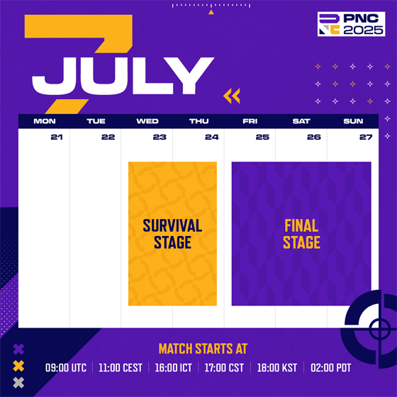 한편, 한국 팀은 빠르게 로스터를 완성하고, PNC 3연패를 위한 준비에 나섰다. 감독은 DN프릭스의 플리케 김성민 감독이 맡았으며, 이어서 국내 '배틀그라운드' e스포츠 전반기 시즌에서 좋은 활약을 펼친 4인이 이름을 올렸다. 살루트 우제현과 규민 심규민(이하 DN 프릭스), 레이닝 김종명(T1), 서울 조기열(디플러스 기아)이 2025년 '배틀그라운드' 한국 대표가 됐다.