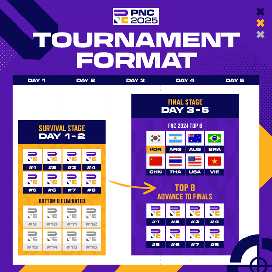 PNC 2025 파이널 무대에 직행하는 8팀은 디펜딩 챔피언인 대한민국을 비롯해 아르헨티나, 호주, 브라질, 중국, 태국, 미국, 베트남이다. 나머지 16개 팀(캐나다, 차이니즈 타이페이, 덴마크, 프랑스, 독일, 인도, 인도네시아, 일본, 말레이시아, 노르웨이, 필리핀, 폴란드, 스페인, 스웨덴, 튀르키예, 영국)은 2일간의 서바이벌 스테이지 매치를 진행한다.