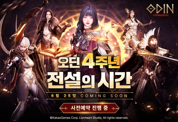 - 카카오게임즈(대표 한상우)는 13일, 라이온하트 스튜디오(의장 김재영)가 개발한 대작 MMORPG ‘오딘: 발할라 라이징’(이하 ‘오딘’)의 서비스 4주년 기념 업데이트의 사전 등록을 시작했다. 이번 사전 등록에 참여하는 이용자는 신청만으로 ‘광명의 11회 아바타/탈것/무기 형상 소환 선택권’과 ‘신성의 11회 아바타/탈것/무기 형상 소환 선택권’을 각각 4장씩 받을 수 있다.