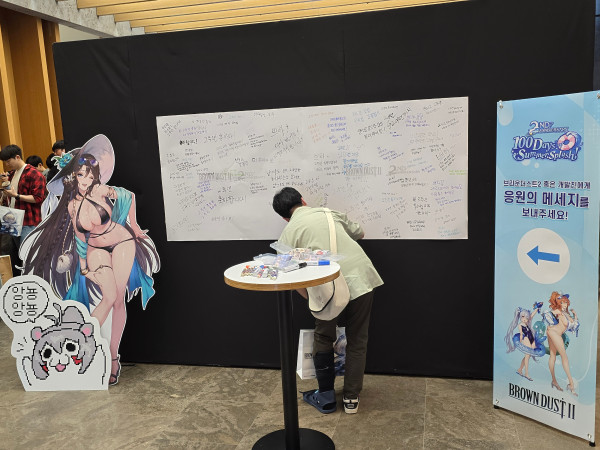 게임과 개발진에 응원의 메시지를 직접 쓸 수 있는 공간도 마련됐다. 입장객에게는 여러 굿즈가 기본으로 지급됐다.