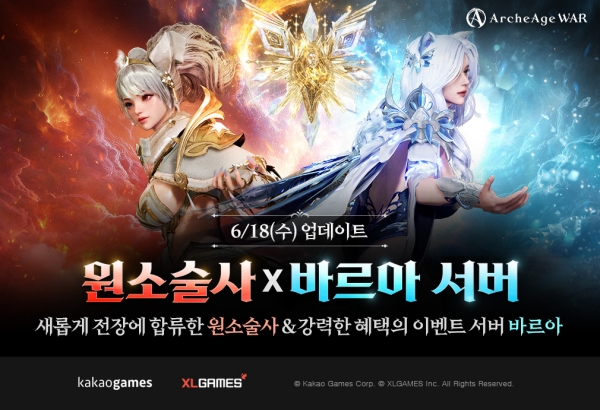 카카오게임즈(대표 한상우)는 18일, PC·모바일 크로스플랫폼 MMORPG ‘아키에이지 워’에 신규 직업 ‘원소술사’와 이벤트 서버 ‘바르아’를 추가하는 업데이트를 실시했다고 밝혔다.