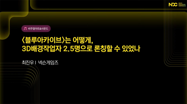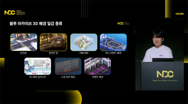 최진우 3D 배경팀 담당은 "11년차 배경 모델러다. 2018년 10월 '블루 아카이브'에 처음 합류했으며 다양한 그래픽 관련 업무를 담당해 왔다. '블루 아카이브'가 소규모 인원으로 게임 론칭을 만들 수 있었던 비결을 항상 물어와 강연에 나서게 됐다"고 말했다.