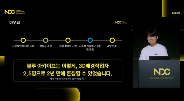 '블루 아카이브' 3D 배경팀은 개발 초기 다양한 난관에 직면하면서 시간과 인력이 부족한 상황이었다. 2.5명의 개발자로 3D 배경 작업을 처리하기 위해서는 먼저 철저한 사전 계획 수립이 필요했고, 3D 배경팀이 몰라도 되는 비즈니스적 부분까지 파악하면서 프로젝트의 고민을 함께 한 것이 특징이다.
