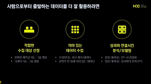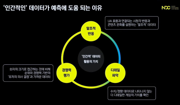 그는 게임 성패 예측의 본질은 더 많은 면을 더 객관적으로 보는 것이라고 강조했다. 앞으로도 다양한 인간적 데이터를 정량화하고 AI와 결합해 예측에 활용할 계획임을 밝혔다. 게임은 수치 데이터와 인간적 경험, 문화가 공존하는 콘텐츠이기 때문에, 사람으로부터 출발하는 데이터를 객관적으로 들여다보는 것이 게임의 본질을 놓치지 않는 길이라고 그는 결론지었다. 게임의 성공을 완벽하게 예측할 수는 없지만, 사람과 데이터의 조화를 통해 그 실마리에 한 걸음 더 다가갈 수 있다는 메시지로 발표를 마무리했다.