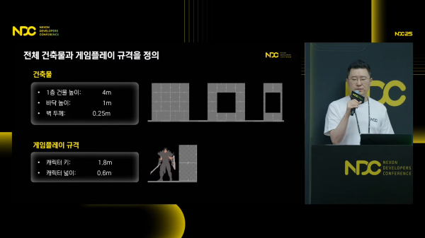 실제 오픈 월드 레벨 디자인을 할 때는 규격을 먼저 정해야 함을 강조했다. 전체 건축물과 게임플레이 규격을 말하는데 건물 높이나, 캐릭터 키 등을 설정되어야 규격에 따라 흥미지점 규모의 설정도 바로 결정된다고 한다.