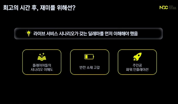 실패 원인을 분석한 결과, 라이브 서비스 시나리오가 갖는 세 가지 딜레마를 발견했다. 첫째는 유저들의 높은 시나리오 이해도로, 새로운 이야기도 기존 세계관을 바탕으로 해석하기 때문에 반응을 예측하기 어렵다는 점이다. 둘째는 20년간 축적된 스토리로 인해 반전 소재가 고갈됐다는 문제다. 더 이상 제공할 충격적인 정보가 없어 유저들의 흥미를 끌기 어려워졌다. 셋째는 주인공의 파워 인플레이션으로, 이미 너무 강해진 유저 캐릭터에게 새로운 위기 상황을 제시하기 어렵다는 점이다.