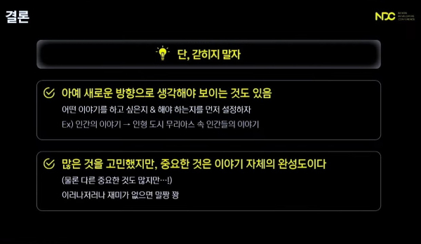 그는 이 경험을 통해 두 가지 중요한 교훈을 얻었다고 밝혔다. 첫째는 기존의 것을 잘 파악해야 한다는 것이다. 유저들이 이미 아는 요소를 비틀면 더 큰 충격을 줄 수 있고, 효율적으로 재미를 전달할 수 있다. 둘째는 '다르게'라는 생각에 갇히지 않아야 한다는 점이다. 어떤 이야기를 하고 싶은지, 어떤 이야기를 해야 하는지를 먼저 설정하는 것이 중요하다.