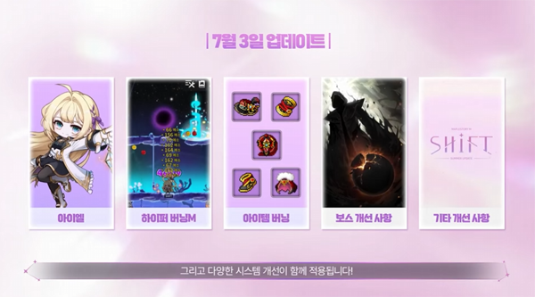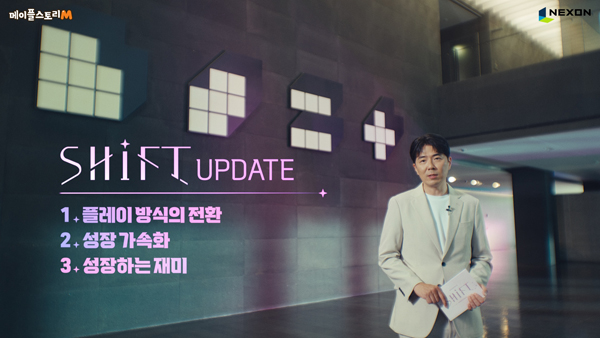 ‘메이플스토리M’ 공식 유튜브 채널에서 공개된 예고 영상에선 이번 대규모 업데이트의 기획 배경과 적용 사항에 대한 김현승 총괄디렉터의 상세한 내용 소개가 이어졌다. 업데이트 타이틀인 ‘시프트(SHIFT)’는 ‘메이플스토리M’의 완전히 새로운 방향을 향한 도약을 의미하며 게임 이용의 불편 요소를 제거하고 나아가 효율적인 성장 경험을 제공하는데 집중하겠다는 업데이트 방향성이 담겼다.
