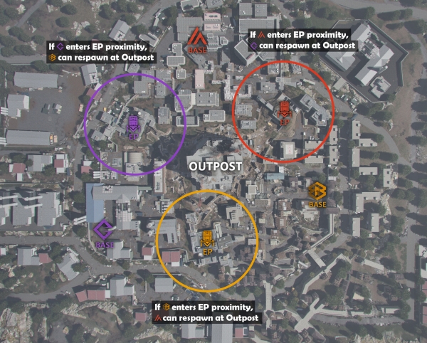 카고가 추출 지점에 충분히 가까워지면, 가장 멀리 떨어진 진영은 임시 전초기지(Outpost)를 설치할 수 있다. 이는 뒤처진 팀에게 재진입 기회를 제공하면서도 방어 팀에게는 새로운 위협 요소를 추가하는 균형 조절 메커니즘이다.