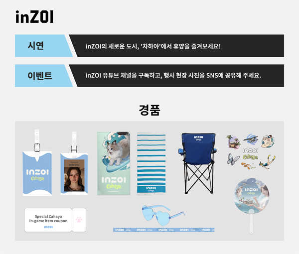 ▲게임 시연 ▲부스 방문 사진 SNS 업로드 ▲인조이 공식 유튜브 채널 구독 등 3가지 활동을 완료하면, 게임에서 사용할 수 있는 차하야 특전 아이템 코드와 게임 내 캐릭터로 제작한 수화물 태그를 받을 수 있다. 또한 뽑기 응모권을 활용해 선글라스, 비치 의자, 타월, 부채 등 다양한 굿즈도 추가로 획득할 수 있다.