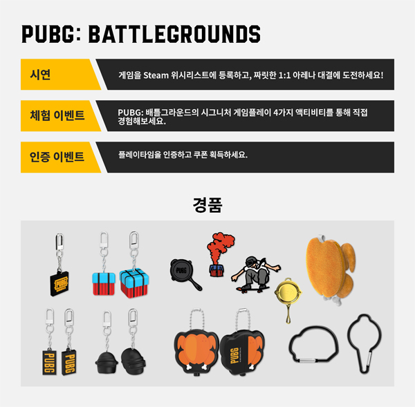 배틀그라운드는 ▲포토존 촬영 ▲망치 치기 ▲사격 체험 ▲아이템 파밍 체험 ▲배틀그라운드 1대1 대결 등 5가지 활동을 모두 완료하면 키링 3종, 클립 고리, 동전 지갑, 고무 패치 등의 다양한 굿즈를 제공한다. 추가로 배틀그라운드 PC와 콘솔 또는 배틀그라운드 모바일의 플레이타임을 인증하면 게임 내 화폐인 ‘지코인’ 쿠폰을 받을 수 있다.