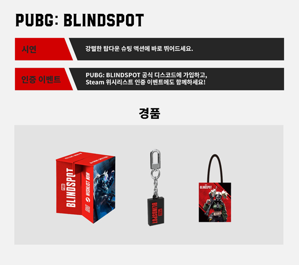 펍지 존은 블라인드스팟과 배틀그라운드를 중심으로 펍지 IP를 체험할 수 있는 공간이다. 블라인드스팟은 ▲게임 시연 ▲스팀 찜하기 ▲디스코드 채널 가입 등 3가지 활동을 통해 로고 키링, 종이 의자 등의 굿즈를 받을 수 있다.