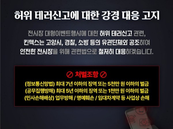 오프라인 행사에 대한 테러 예고는 불특정 다수에 대해 큰 피해를 주는 행위이자 범법 행위다. 행사를 준비하는 회사 입장에서는 운영을 제대로 할 수 없고, 행사를 찾은 관람객 입장에서는 제 시간에 관람을 할 수 없게 된다.