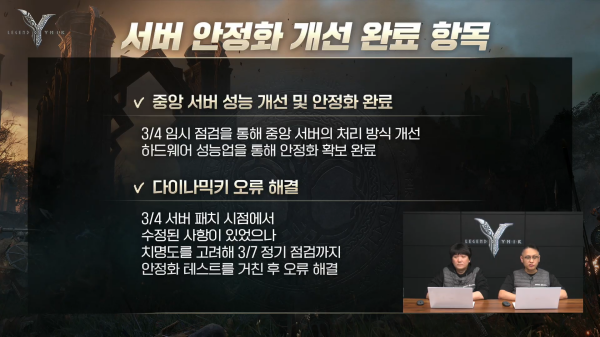 최근 불안했던 서버 안정화 개선이 완료됐다. 일단, 3월 4일 임시 점검을 통해 중앙 서버의 처리 방식을 개선했고, 하드웨어 성능업을 통해 안정화 확보를 완료했다.