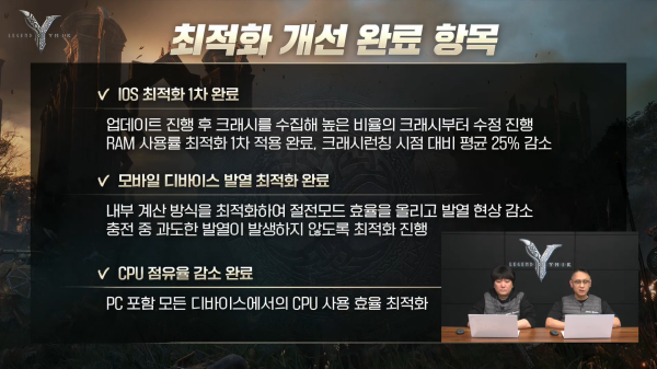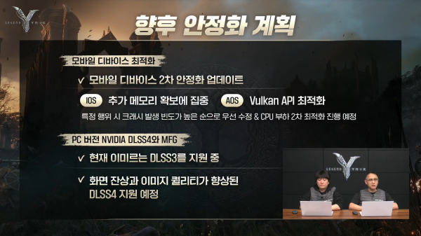 또한, 서버 안정화를 위해 일반 필드에서 PvE 콘텐츠 이용 빈도가 높아지면서 발생하는 서버 CPU 사용률 개선도 진행한다. 모바일 디바이스는 2차 안정화 업데이트를 진행해 추가 메모리 확보에 집중하고, 불칸 API 최적화도 함께 실시한다. PC 버전에서는 엔비디아 DLSS4를 지원해 화면 잔상과 이미지 퀄리티가 향상될 예정이다.