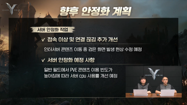 서버 안정화를 위해 접속 이상 및 연결 끊김 개선 작업을 진행 중이다. 이를 위해 인터서버 콘텐츠 이동 중에 발생하는 검은 화면 현상을 수정하고 있다.