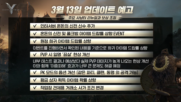 PvP 상황에서 빠르게 사망하는 끔살 현상도 개선된다. 그밖에 PK 모드의 옵션 개선, 황금 상자 획득 아이템 확률 상향, 작업장을 거래 하기 위해 거래소 사가 조건이 변경된다.