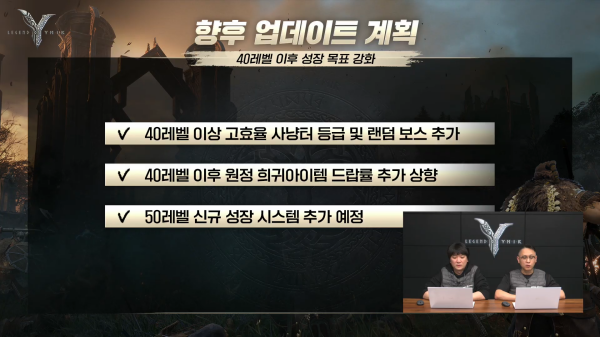 향후에는 40레벨 이후의 성장 목표를 강화하도록 관련 업데이트를 진행한다. 우선, 40레벨 이상이 참여할 수 있는 고효율 사냥터 등급 및 랜덤 보스를 추가한다. 40레벨 이후의 원정 희귀아이템 드랍률이 추가 상향되고, 50레벨 신규 성장 시스템도 선보일 예정이다. 신규 성장 시스템은 기존 MMORPG의 전직이나 각성과 유사하게 클래스의 특징을 강화하는 방식이다.