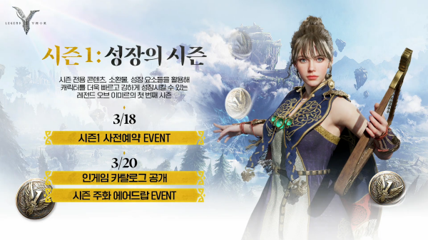 '이미르'의 첫 시즌이 찾아온다. 오는 3월 18일 사전예약 이벤트를 진행하고, 20일에는 인게임 카탈로그 공개, 시즌 주화 에어드랍 이벤트를 실시한다.