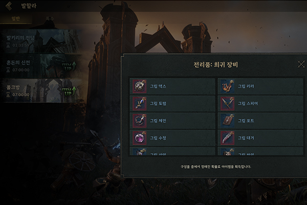 폴크방과 혼돈의 신전에서는 ▲전리품: 희귀 장비가 드랍된다. 구성품으로 희귀 등급의 무기와 상의, 헬멧, 장신구, 생활장비 등 다양한 부위에 걸친 장비를 얻을 수 있다.