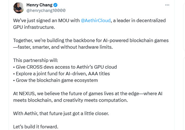 양사의 MOU를 통해 더욱 빠르고 하드웨어 제한이 없는 AI 기반 블록체인 게임 구축을 위해 힘쓴다. 먼저 크로쓰 개발자에게 에이셔 GPU 클라우드에 대한 액세스 권한이 제공되며, AI 기반 AAA급 타이틀을 위한 공동 기금 구축에 나선다.