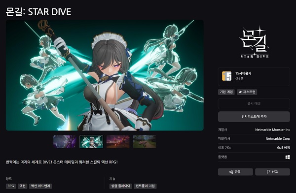 에픽게임즈는 이 발표와 동시에 에픽게임즈 스토어에 ‘몬길: 스타다이브’의 스토어 페이지를 공식 오픈했다. 이에 따르면 ‘몬길: 스타다이브’의 최소 사양은 인텔 i3 CPU, 8GB 메모리, 지포스 RTX 1060급 그래픽카드, 50GB의 용량 등의 구성이라고 밝혀, 게임 퀄리티 대비 상당히 낮게 잡은 것으로 나타났다. 또한 지원 언어의 경우 자막은 12개국 언어를 지원하고, 음성은 한국어와 영어, 일본어를 지원하는 것으로 확인됐다.