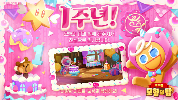 쿠키런: 모험의 탑은 1주년을 기념해 각종 보상을 선물하는 다양한 이벤트도 선보인다. 놀이공원 테마 공간 ‘달콤한 슈가랜드’에서는 1주년 한정 콘텐츠인 ▲젤리빈 범퍼카 라이드 ▲캔디 팡팡 스매시 ▲롤링 파티 트랙 ▲케이크 타워 쌓기 등 미니 게임을 플레이해 크리스탈을 모을 수 있다.