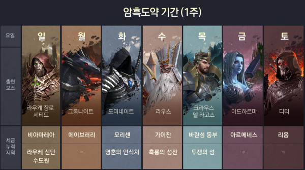 영지 보스 시스템도 암흑도약과 연계해 개편됐다. 영지 보스는 암흑도약 기간에만 등장하며, 종료 후 2주간은 출현하지 않는다. 이 기간에도 영지 세금은 누적되고, 2주가 지나면 다시 암흑도약이 시작된다. 각 영지 보스는 3주간(암흑도약 1주+미출현 2주) 누적된 세금을 보유하며, 암흑도약 기간에 1위 기여도로 보스를 처치한 길드에 해당 세금이 지급된다. 최초 업데이트 주에는 밸런스를 고려해 임의의 세금이 부여된다. 누적 세금은 월드맵에서 확인할 수 있다.