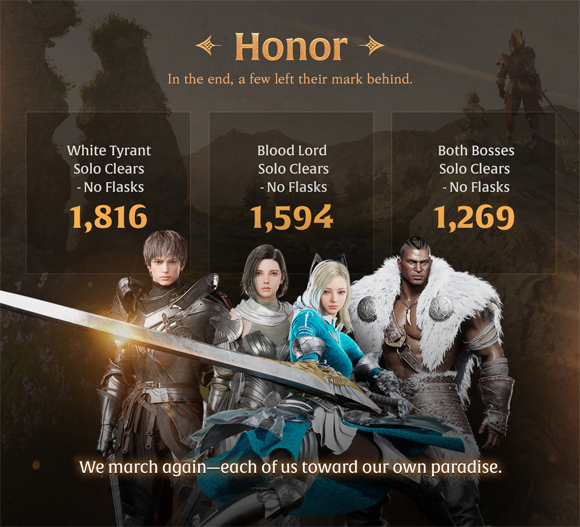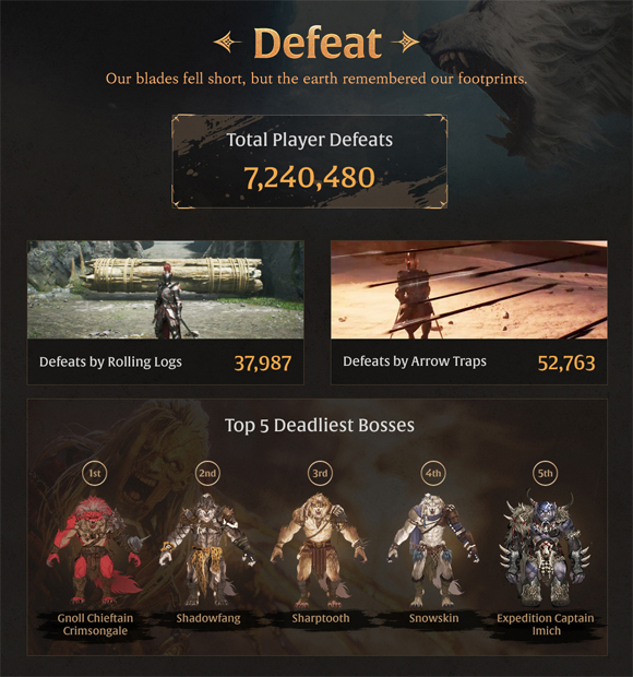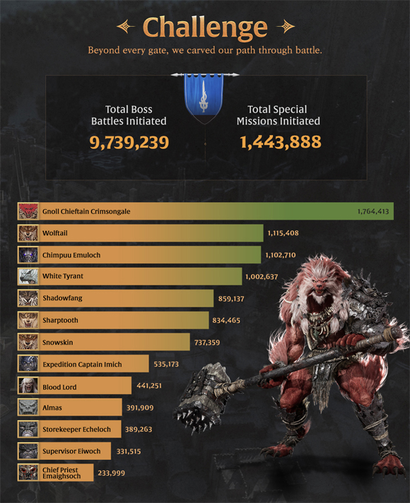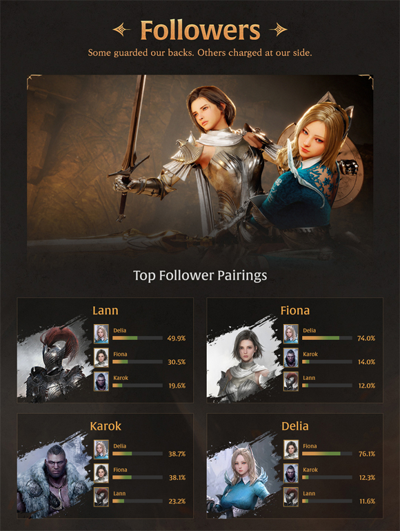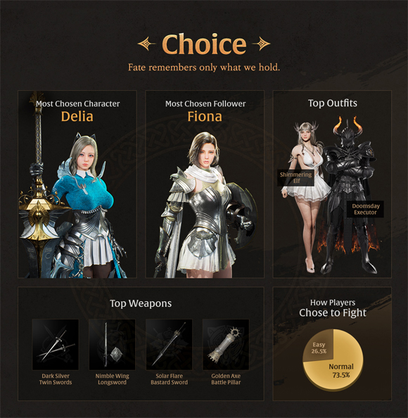 또, 신규 캐릭터 ‘델리아’가 가장 높은 인기를 기록한 가운데, 방어 기반 전투에 강점을 지닌 ‘피오나’가 동료인 펠로우로 가장 많은 선택을 받았다. 플레이어를 가장 많이 처치한 보스는 ‘놀 치프틴 카마인거스트’로 파악됐으며, 특수 의뢰 콘텐츠로 만나 볼 수 있었던 보스 몬스터 '블러드로드'는 총 154,426회 처치됐다.