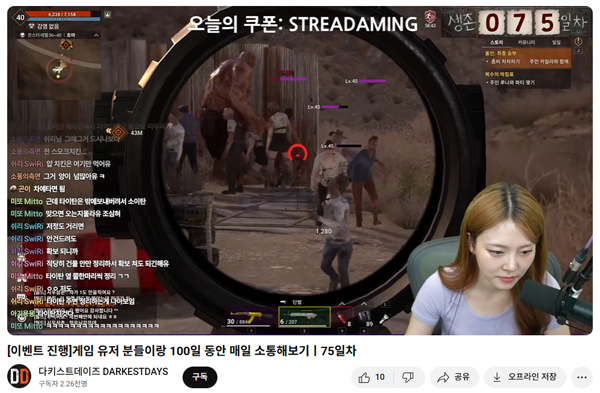 어느덧 75일차를 맞이한 공식 방송은 개발자 라이브 방송의 새로운 이정표를 세웠다. 꾸준한 소통으로 게임 속 노하우 전달, 신규 콘텐츠 소개 및 유저 질문에 라이브로 답변을 펼치는 등 새로운 방식의 게임 서비스를 통해 '다키스트 데이즈'의 품질을 더욱 높여주고 있다.