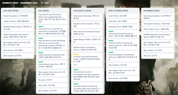 트렐로 현황판에서는 개발 중인 차기 콘텐츠와 수정이 필요한 수정 사항들을 모두 담아냈다. 더불어 2025 로드맵도 포함되면서 유저들이 언제든지 게임의 개발 현황을 살펴보고, 다양한 의견과 피드백을 줄 수 있도록 구성된 것이 핵심이다.