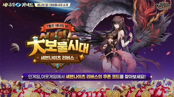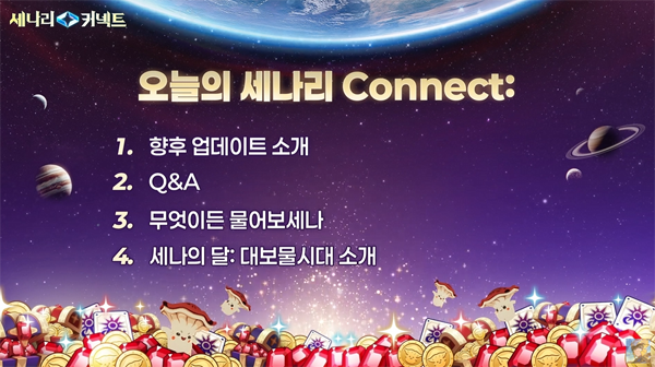 '세나리 커넥트' 방송은 마지막으로는 세나의 달: 대보물시대에 대한 콘텐츠 소개를 진행했다. 게임 안과 밖에 숨겨진 코드 번호를 유저들이 찾아내는 형태의 이벤트로, 총 77회의 쿠폰 번호를 준비한 것이 특징이다.
