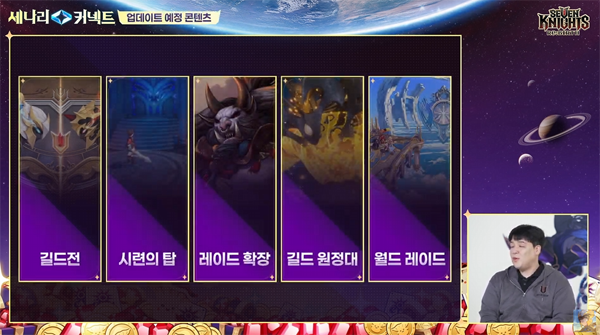 이어 콘텐츠 소개도 진행됐다. 길드전, 시련의탑, 레이드 확장, 길드 원정대, 월드 레이드가 다음 업데이트에 적용된다. 더해질 길드전에서는 보상으로는 (구)세나 캐릭터가 제공된다. 이어 시련의 탑은 유저 스스로 버프와 디퍼프를 설정하여 난이별로 도전 콘텐츠를 즐길 수 있게 구성될 예정이다.