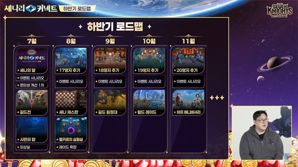 '세나리 커넥트' 방송은 업데이트 소개와 유저 질의응답 시간을 진행하며 시작됐다. 새로운 콘텐츠와 영웅 소개는 물론, 7월 세나의 달을 맞이하여 유저들에게 선보일 다양한 이벤트들이 차례대로 공개됐다. 더불어 하반기 로드맵부터 개선 사항들을 공유했다.