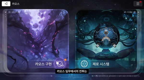 카오스 임무는 던전 탐험형 플레이로, 플레이 시간은 최소 5분부터 15분 이상도 가능하다. 캐릭터가 가진 기본 덱으로 탐험을 시작해, 전투 중에 각자의 잠재력을 깨우치며 성장한다. 새로운 스킬 발견, 스킬 부가 효과 등을 거쳐 '운명'이라는 강력한 성장으로 빌드의 방향성을 잡아주는데, 이런 과정은 전투 중에 발생해 효과를 즉시 체감할 수 있다.