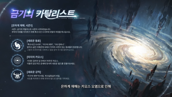 '카오스 제로 나이트메어'의 서비스는 시즌 콘텐츠로 진행된다. 시즌1 '은하계 재해'는 카오스 오염으로 인해 우주에서 일어나는 재해급 사건들을 다룬다. 주요 콘텐츠는 새로운 동료와 미지의 카오스, 새로운 강적으로 구성되며, 플레이어는 추락의 미래를 저지하기 위해 특수사건 수사부와 비밀의 여정을 떠나게 된다.