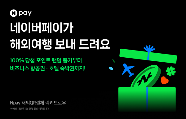 네이버페이(Npay)가 오는 9월까지, Npay 해외QR결제와 관련된 다양한 미션에 참여하면 추첨을 통해 비즈니스 항공권 및 호텔 숙박권부터, Npay 포인트 100% 당첨 등의 경품을 받을 수 있는 ‘럭키드로우’ 프로모션을 진행한다.