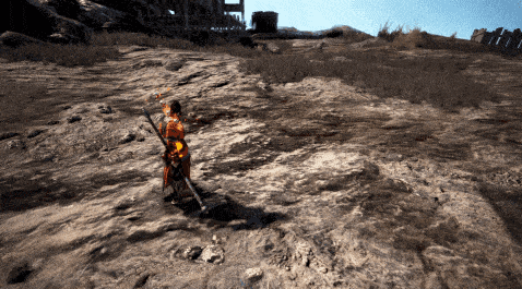 ▲메다꽂히거라는 공중으로 뛰어올라 봉에 담긴 도력을 지면으로 뿜어내는 기술로, 제천대성 모드에서는 황금빛 불길을 일으킨다.