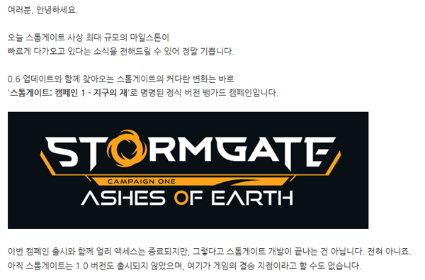 지난 2024년 8월, 새로운 시대의 게임을 목표로 나선 카카오게임즈의 '스톰게이트'가 약 11개월 동안 이어진 얼리액세스 서비스 단계를 종료한다. 이어질 0.6 업데이트에서는 신규 콘텐츠 및 캠페인이 등장할 것으로 예고됐다.