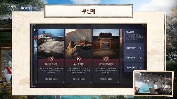 투기장 개념의 PvP 콘텐츠 '무신제'도 업데이트된다. 1대 1의 최강자전과 대련, 2대 2로 진행되는 단체전 등의 모드를 지원한다. 최강자전은 장사-교위-부장-장군-대장군-무신으로 등급이 나눠진다. 한국 서버는 7월 22일, 글로벌 서버는 8월 5일 업데이트된다.