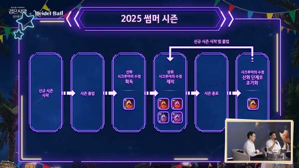 2025년 ‘썸머 시즌’이 7월 22일 전 세계 동시 개시된다. 시즌 보상으로는 ‘시크루아의 수정’이 새롭게 졸업 보상으로 제공되며, 이는 외형 장식에 장착 가능한 공격력·방어력 +50의 아이템이다. 강화 시 ‘공허’ 등급까지 상승 가능하며, 필드 아이템 드랍률이 최대 5% 상승하는 효과도 부여된다. 100% 확률로 강화할 수 있다.