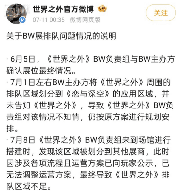 전시업체들의 불만도 적지 않았는데, 넷이즈의 '비욘드 더 월드(세계지외)'는 웨이보에 공개적으로 “BW 운영에 관여해서는 안 되며, 내년 BW에 참가하지 않겠다”라고 선언했다. 이에 대한 온라인 논쟁은 자정까지 멈추지 않았고, '러브앤딥스페이스' 전시팀도 휘말렸다.※
