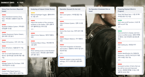 또한, 게임의 개발 진행 상황을 알 수 있는 공식 트렐로를 유저들에게 공유하면서 업데이트를 실시간으로 파악할 수 있게 구성했다. 이를 통해 유저들은 게임이 가지고 있는 방향성과 현재 집중하고 있는 콘텐츠를 쉽게 파악할 수 있게 됐고, 게임을 안정적으로 즐길 수 있는 기반이 마련됐다.