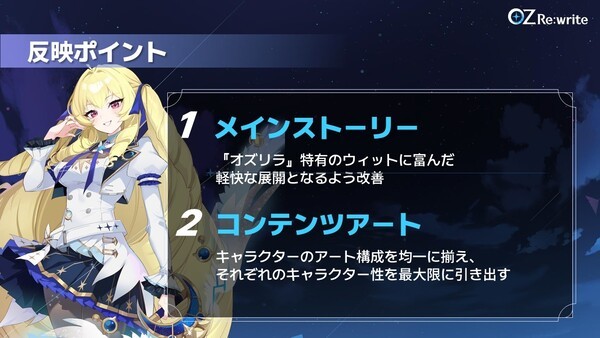 또한 메인 스토리와 관련해 “전개가 다소 느리고, 이야기의 연결이 약하다”는 지적이 있었기 때문에, 스토리 전체의 전개와 구성을 조정했다. 이 작품의 매력인 유머러스하고 경쾌한 이야기 전개가 될 수 있도록 개선을 가했다고 설명했다.