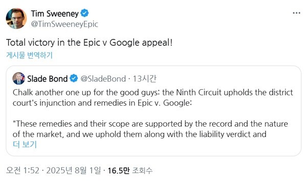 에픽게임즈 팀 스위니 CEO는 이날 자신의 SNS를 통해 "에픽과 구글의 항소심의 완벽한 승리"라며 "이번 판결 덕분에 안드로이드용 에픽게임즈 스토어가 구글 플레이스토어에 출시될 예정"이라고 밝혔다.
